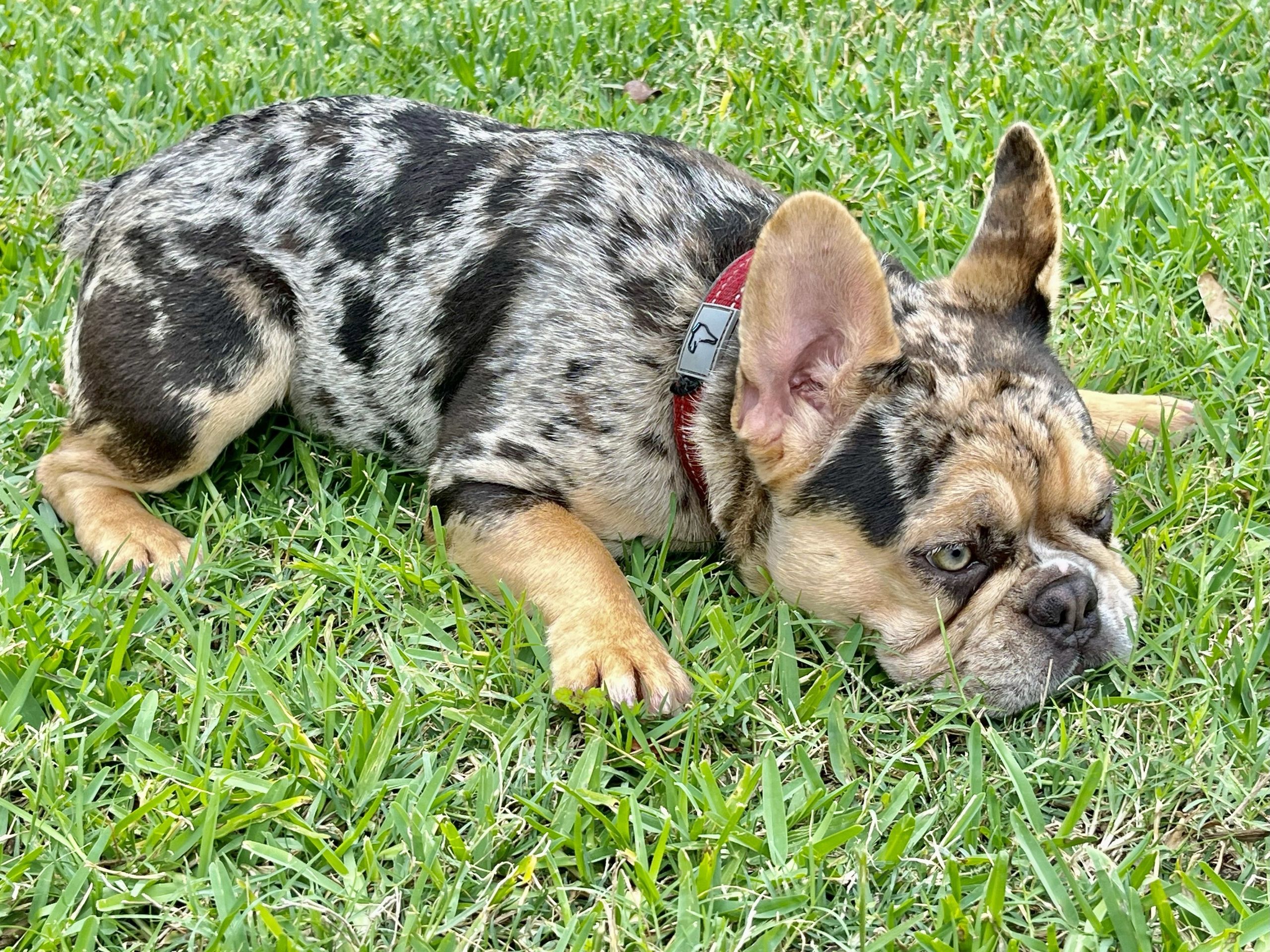 Stella Artois is an exotic blue merle French Bulldog carrying chocolate with clean lines and definition. She is loving, energetic and enjoys playtime.